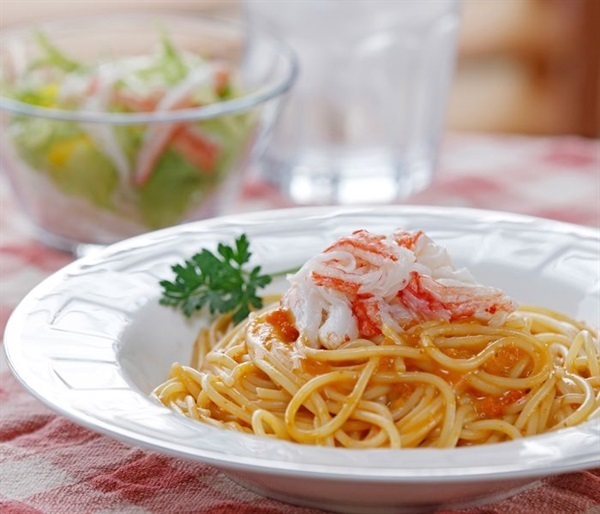 レタスやアボカドと和え、フレンチドレッシングやマヨネーズで和えるだけ。ズワイガニの繊細な甘さが際立つ、色鮮やかな前菜になります。