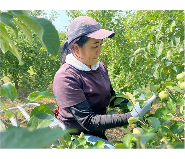 一般的なりんごは日持ちさせるため、少し青い状態で収穫されます。「星の金貨」は、雪が降る前まで樹の上で熟成させる「完熟」にこだわっています。1本から取れる数量を減らし、さらに光合成量を増やすために、葉っぱをギリギリまで取らずに栽培。この手間をかけた収穫方法こそが、糖度が高く、蜜のような深い甘さと芳醇な香りを生み出す秘訣です。